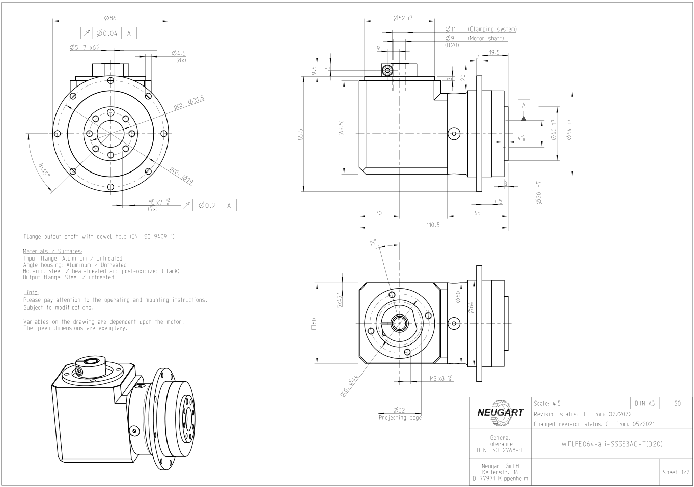 WPLFE right-angle planetary gearbox adopts flange output mode, the overall structure is compact, saves one third of the installation space, and can be installed normally in some relatively narrow installation environments. This WPLFE gearbox has high torsional rigidity, and the built-in positioning pin holes also provide a certain safety guarantee for installation. The WPLFE gearbox has three structural sizes of 64, 90, and 110 to choose from. The overall structural size can be understood in the drawings below. If you need to customize it, you can contact the technology online. Planetary gearbox CAD drawing download, 3D model download, etc. are available.